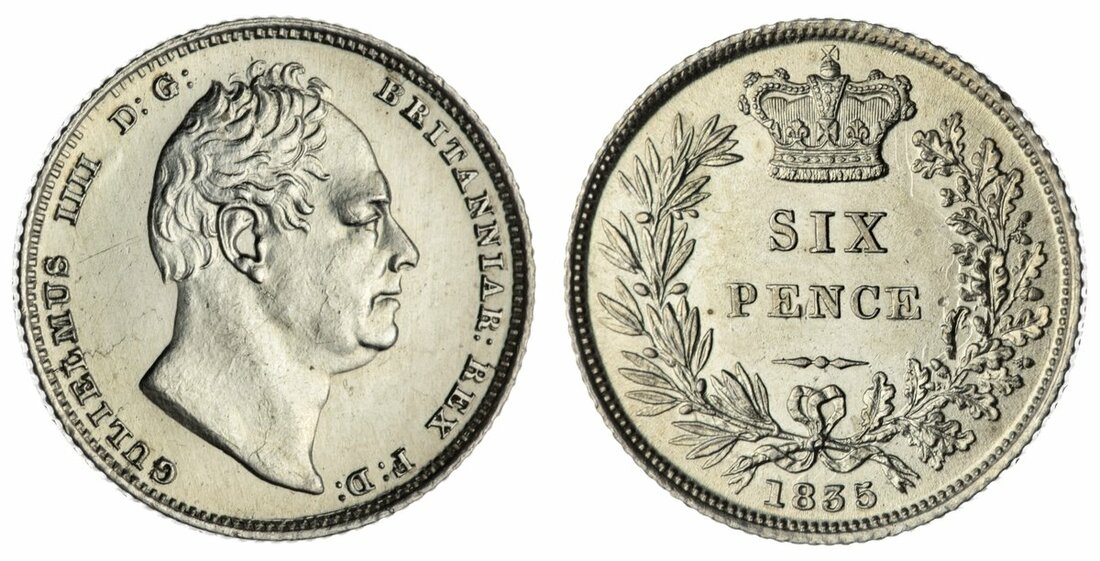 William IV (1830-1837), Sixpence, 1835, bare head right, rev. crowned denomination within wreath, milled edge, 2.82g, 6h (Bull 2508; ESC 1676; Spink 3836), die flaw through second L of GUILELMUS, harshly polished on obverse, otherwise residually lustrous, extremely fine