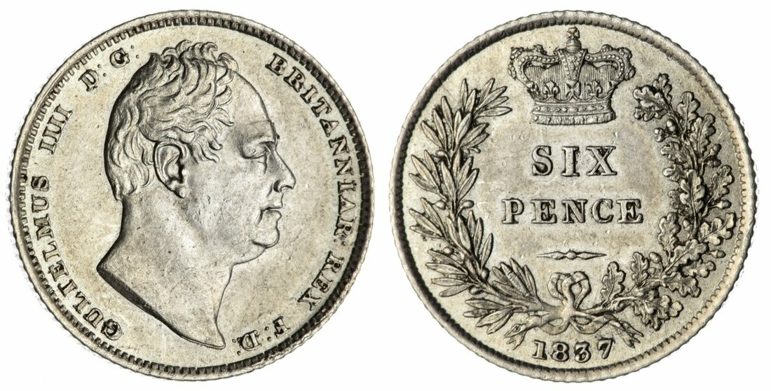 William IV (1830-1837), Sixpence, 1837, bare head right, rev. crowned denomination within wreath, milled edge, 2.83g, 6h (Bull 2512; ESC 1680; Spink 3836), lightly cleaned but lustrous, extremely fine