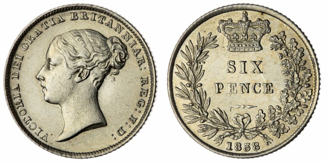 Victoria (1837-1901), 'Young Head' Sixpence, 1838, Type A¹, first young head left, rev. crowned denomination within wreath, milled edge, 2.84g, 6h (Bull 3168; ESC 1682; Spink 3908), lightly wiped but residually lustrous with hairlines, extremely fine