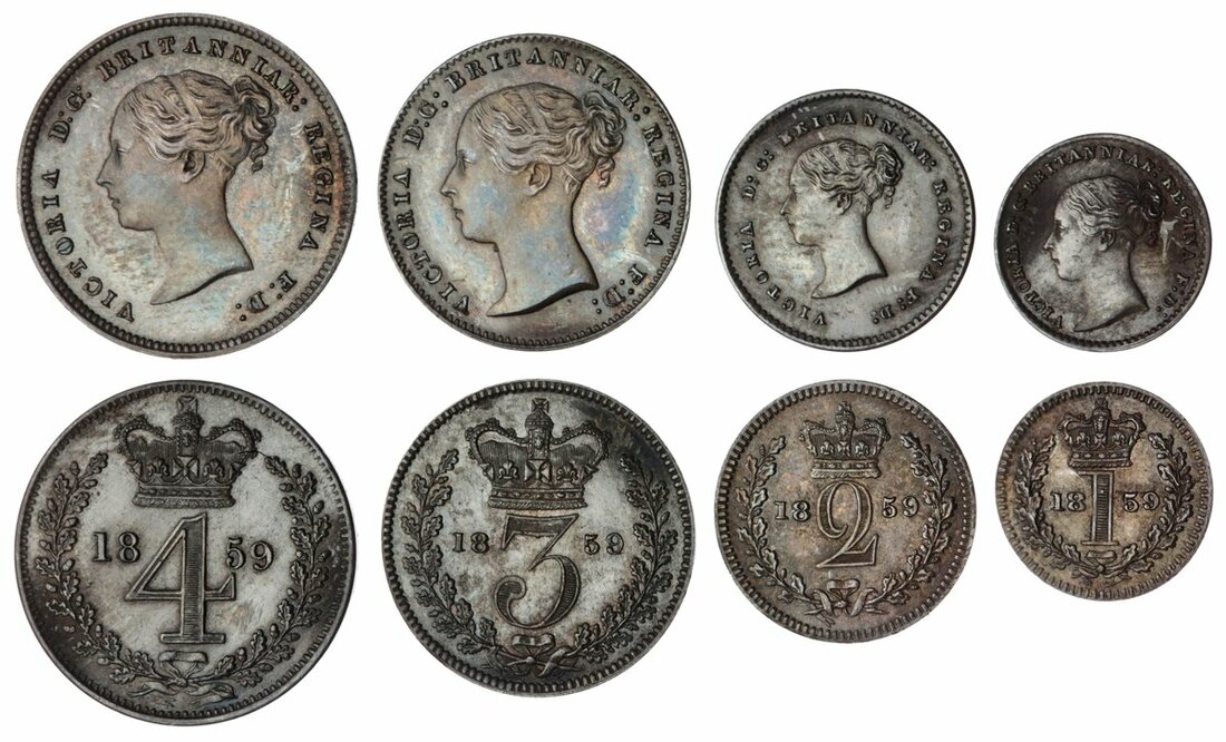 Victoria (1837-1901), 'Young Head' Maundy Set, 1859, young head left, rev. crowned mark of value, edge plain (Bull 3504; ESC 2470; Spink 3916), darkly toned and residually lustrous, near extremely fine (4)