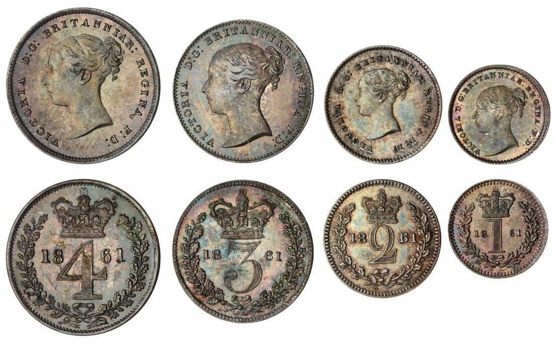 Victoria (1837-1901), 'Young Head' Maundy Set, 1861, young head left, rev. crowned mark of value, edge plain (Bull 3507; ESC 2472; Spink 3916), the Twopence with 6 over 1touch of rub to Threepence, otherwise attractively lustrous and toned, practically extremely fine (4)