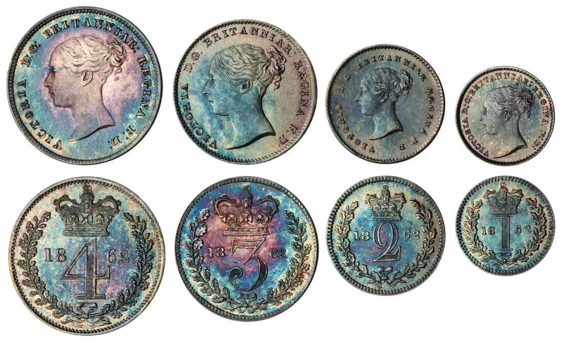 Victoria (1837-1901), 'Young Head' Maundy Set, 1862, young head left, rev. crowned mark of value, edge plain (Bull 3509; ESC 2473; Spink 3916), highly lustrous and attractively toned with hues of petrol blue, extremely fine (4)