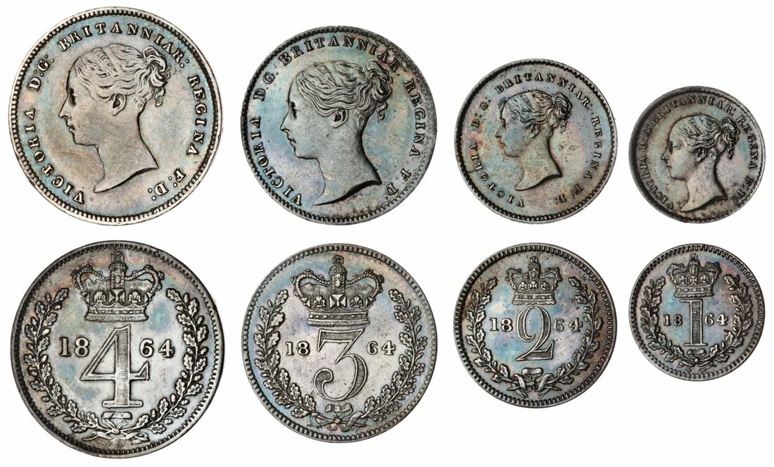 Victoria (1837-1901), 'Young Head' Maundy Set, 1864, young head left, rev. crowned mark of value, edge plain (Bull 3512; ESC 2475; Spink 3916), the Fourpence lightly polished, otherwise lustrous and darkly toned, bolder very fine (4)