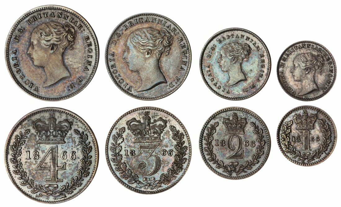 Victoria (1837-1901), 'Young Head' Maundy Set, 1866, young head left, rev. crowned mark of value, edge plain (Bull 3514; ESC 2477; Spink 3916), touch of rub to Fourpence, otherwise darkly toned and lustrous, near extremely fine (4)