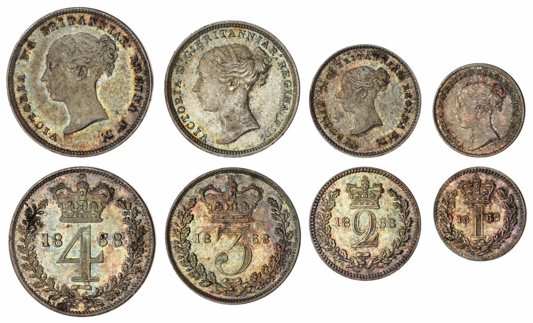 Victoria (1837-1901), 'Young Head' Maundy Set, 1868, young head left, rev. crowned mark of value, edge plain (Bull 3518; ESC 2480; Spink 3916), toned yet somewhat frosted surfaces, good very fine (4)