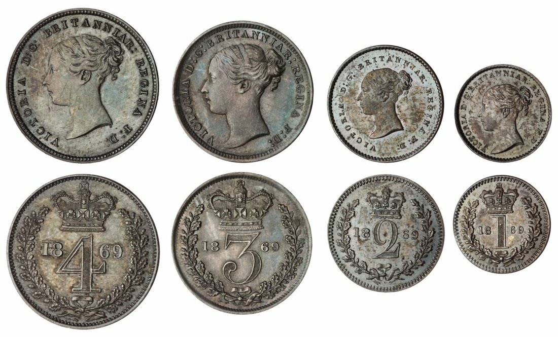 Victoria (1837-1901), 'Young Head' Maundy Set, 1869, young head left, rev. crowned mark of value, edge plain (Bull 3521; ESC 2481; Spink 3916), some hairline marks to Fourpence bust, otherwise darkly toned and residually lustrous, near extremely fine (4)
