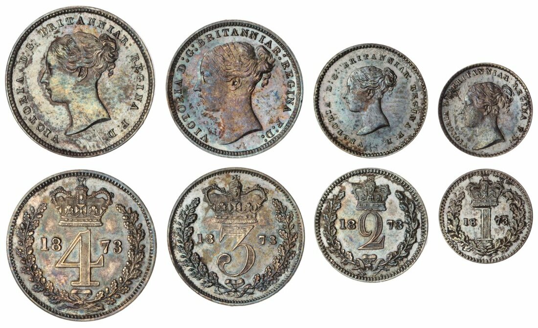 Victoria (1837-1901), 'Young Head' Maundy Set, 1873, young head left, rev. crowned mark of value, edge plain (Bull 3526; ESC 2486; Spink 3916), scratch to Fourpence bust, otherwise highly lustrous and darkly toned, good very fine to extremely fine (4)