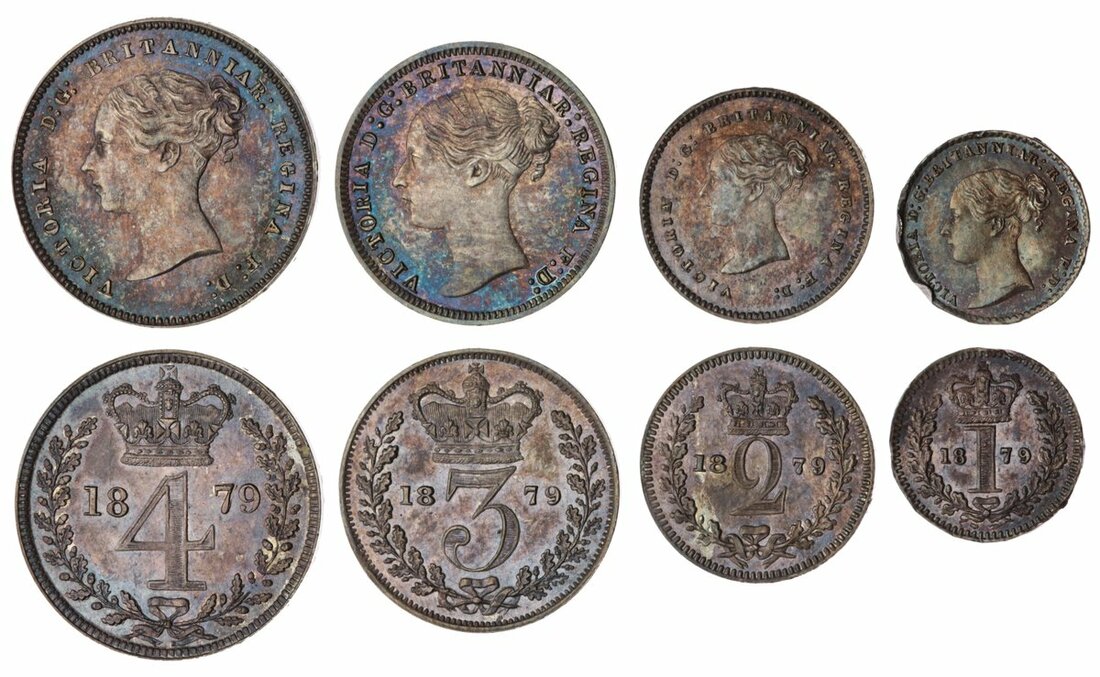 Victoria (1837-1901), 'Young Head' Maundy Set, 1879, young head left, rev. crowned mark of value, edge plain (Bull 3533; ESC 2493; Spink 3916), damage of Penny edge between 7 and 12 o'clock, otherwise all toned and lustrous, very fine to near extremely fine (4)