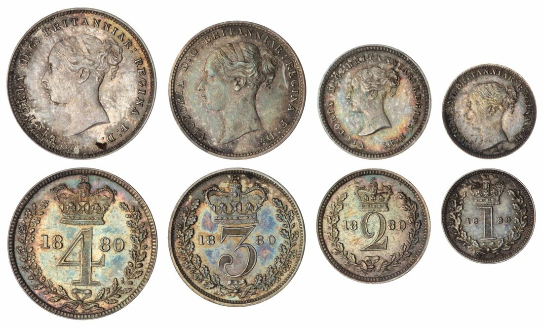 Victoria (1837-1901), 'Young Head' Maundy Set, 1880, young head left, rev. crowned mark of value, edge plain (Bull 3535; ESC 2494; Spink 3916), hairline scratch through Fourpence obverse, otherwise toned and lustrous, bolder very fine to extremely fine (4)