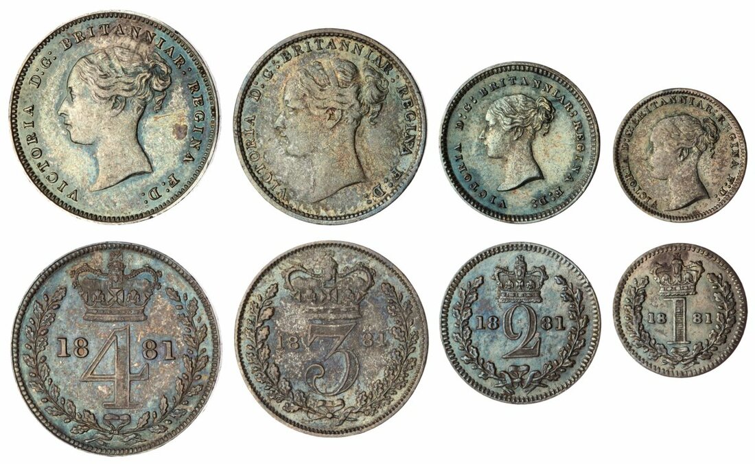 Victoria (1837-1901), 'Young Head' Maundy Set, 1881, young head left, rev. crowned mark of value, edge plain (Bull 3536; ESC 2495; Spink 3916), lightly rubbed and with contact marks, othewise toned, very fine (4)