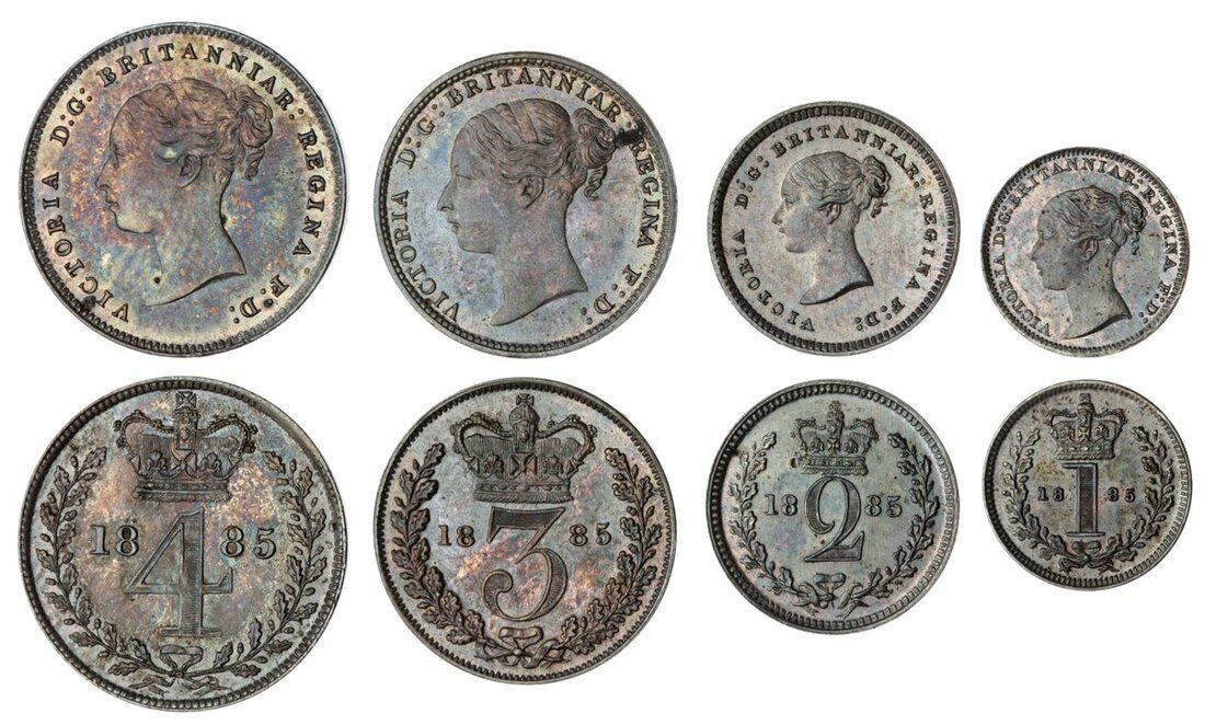 Victoria (1837-1901), 'Young Head' Maundy Set, 1885, young head left, rev. crowned mark of value, edge plain (Bull 3542; ESC 2499; Spink 3916), some black marks to surfaces, otherwise lustrous and toned, extremely fine (4)