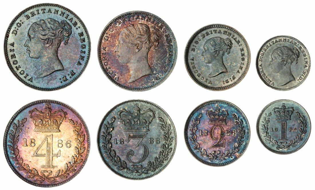 Victoria (1837-1901), 'Young Head' Maundy Set, 1886, young head left, rev. crowned mark of value, edge plain (Bull 3543; ESC 2500; Spink 3916), a handful of hairline marks, yet lustrous and with somewhat speckled toning, near extremely fine (4)