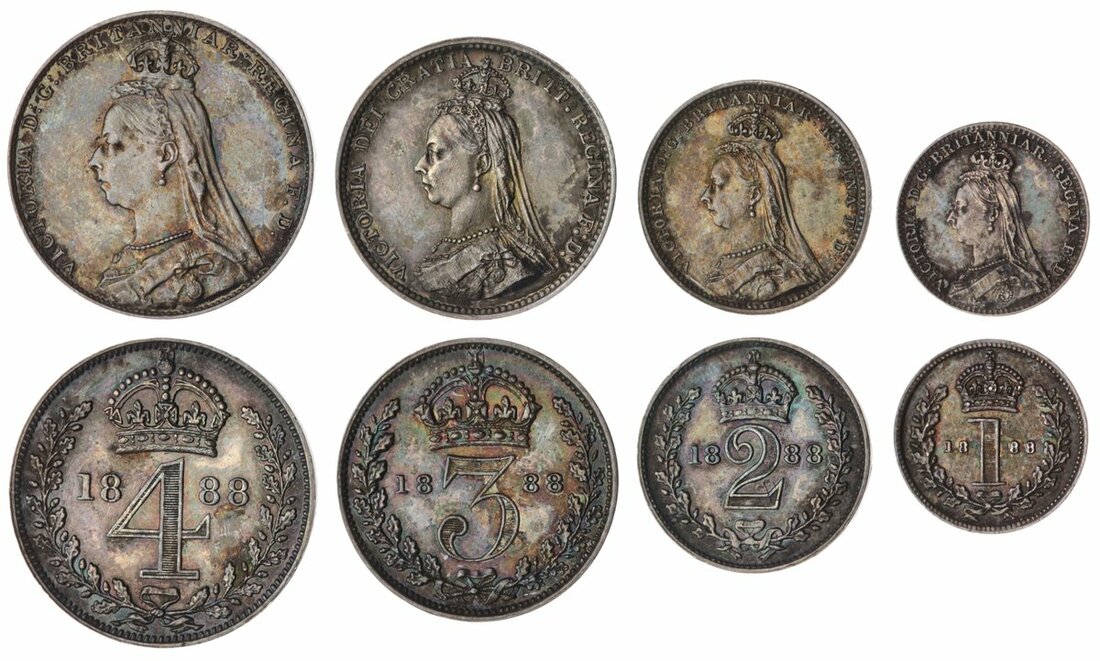 Victoria (1837-1901), Maundy Set, 1888, 'Jubilee' head left, rev. crowned mark of value, edge plain (Bull 3545; ESC 2502; Spink 3932), touches of rub and some contact marks, otherwise with dark toning and lustrous, very fine (4)