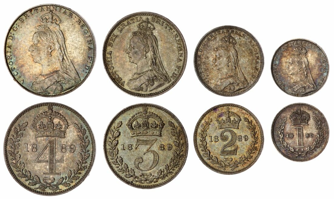 Victoria (1837-1901), Maundy Set, 1889, 'Jubilee' head left, rev. crowned mark of value, edge plain (Bull 3547; ESC 2504; Spink 3932), some very light surface marks, otherwise lustrous and lightly toned, bolder very fine (4)