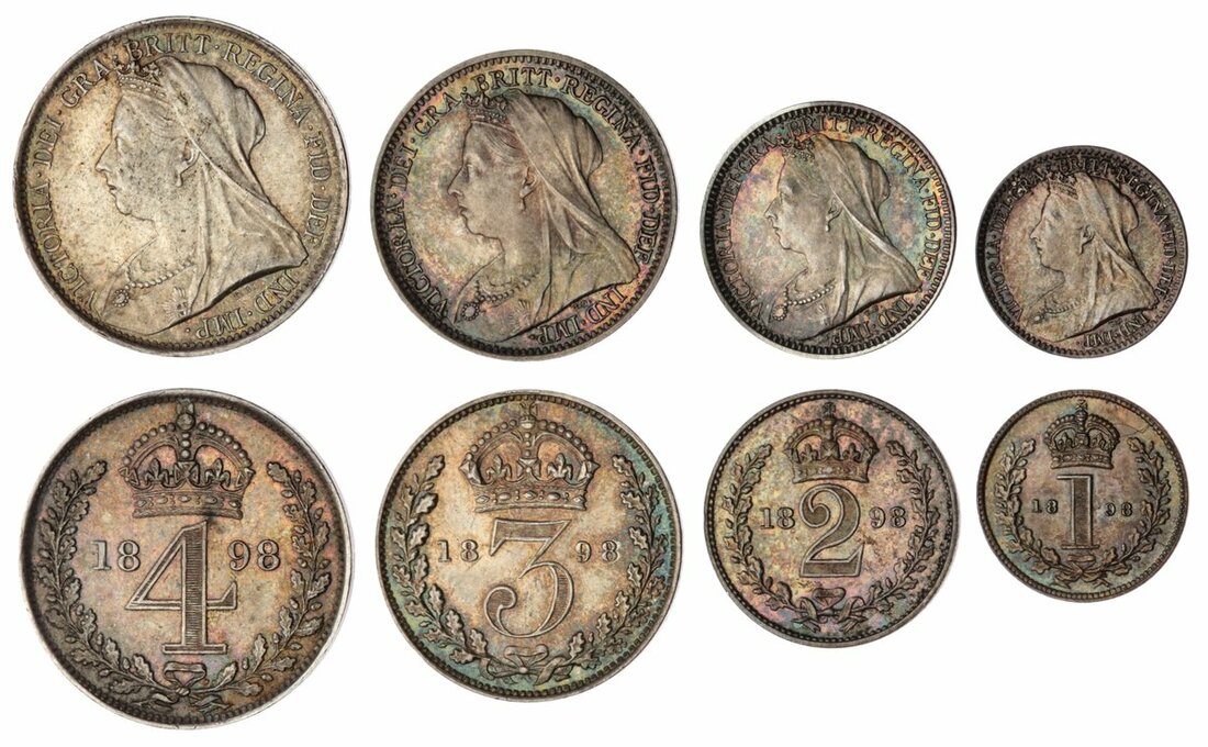 Victoria (1837-1901), Maundy Set, 1898, veiled head left, rev. crowned mark of value, edge plain (Bull 3556; ESC 2513; Spink 3943), hairline scratch to Fourpence obverse, otherwise all toned and with attractive lustre, bolder very fne to extremely fine (4)