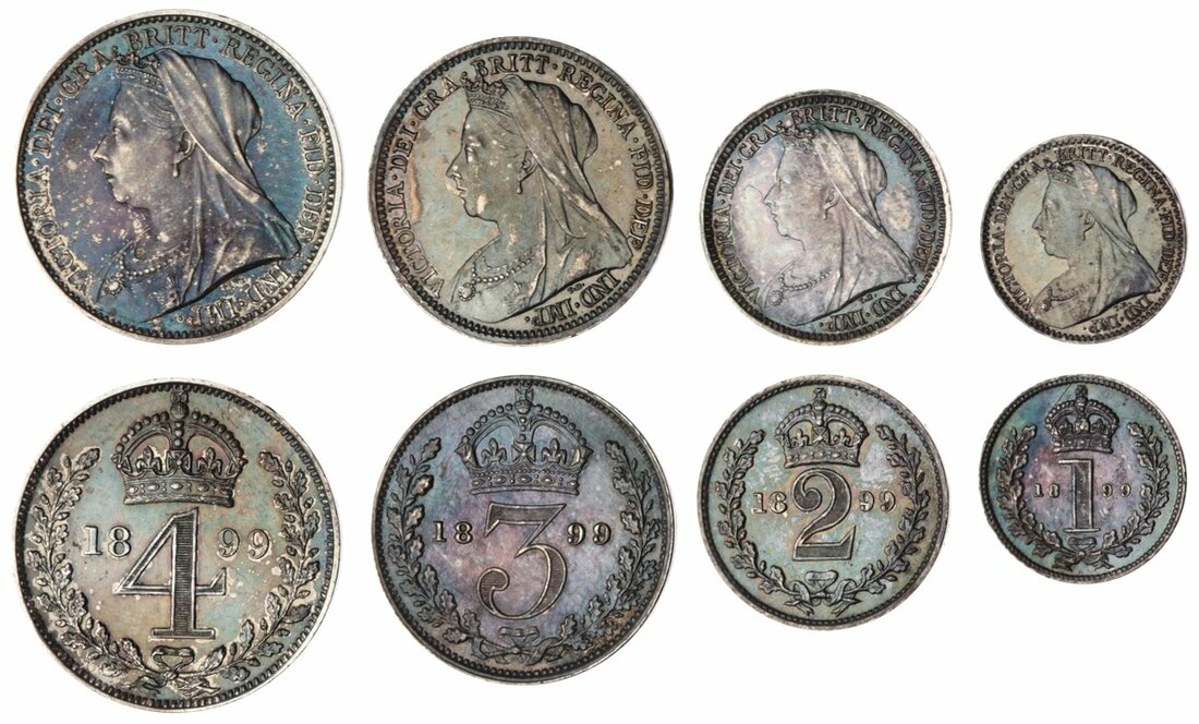 Victoria (1837-1901), Maundy Set, 1899, veiled head left, rev. crowned mark of value, edge plain (Bull 3557; ESC 2514; Spink 3943), a handful of light surface marks, uneven toning, yet largely lustrous, bolder very fine (4)