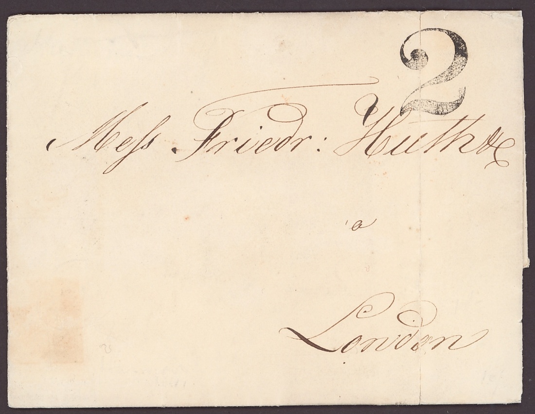1841 (7 May) Huth correspondence entire letter to London, posted unpaid, on reverse Harwich c.d.s. and on the front a superb handstruck "2" (crossed by a clean vertical filing crease); fine and scarce