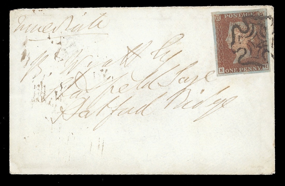 1841 (24 Nov.) envelope addressed in the Duke of Wellington's hand to Hartford Bridge, bearing 1d. red, EH, plate 16, tied by black Maltese Cross, with Wellington's wax seal and Hartford Bridge d.s. on reverse. Some minor foxing all round though scarce.