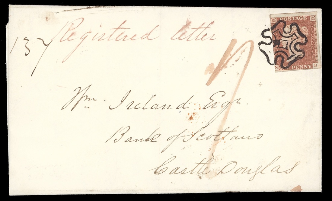 1842 (20 May) entire letter from Glasgow to Castle Douglas endorsed 'registered letter' and charged '1/-', bearing 1d. red (cut into), tied by superb black Glasgow Maltese Cross, with Glasgow and Castle Douglas d.s. on reverse; and early use of the shilling rate. Fine