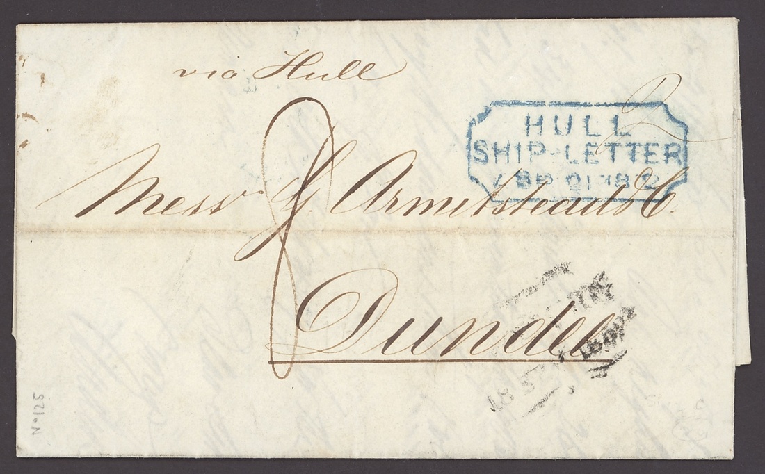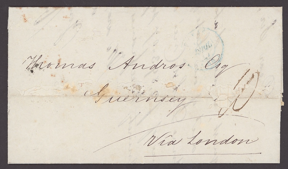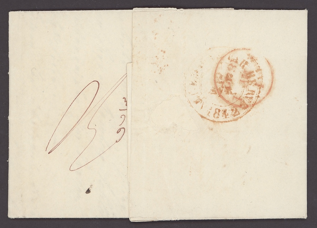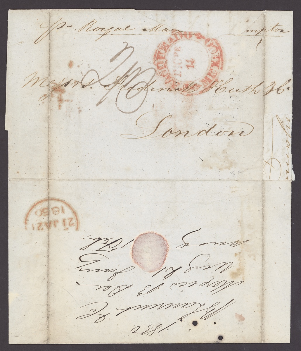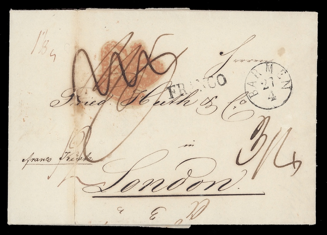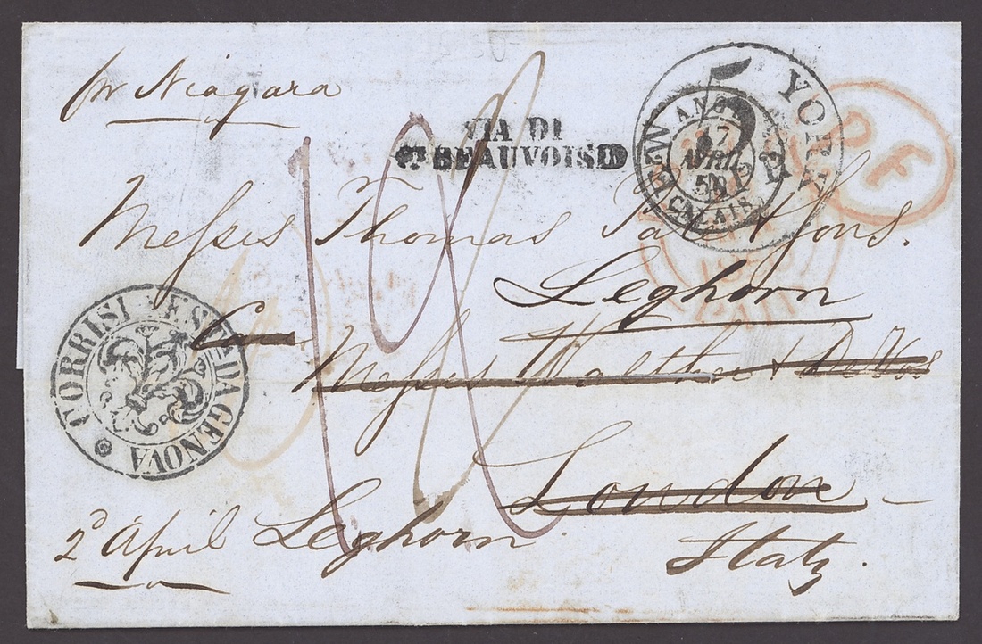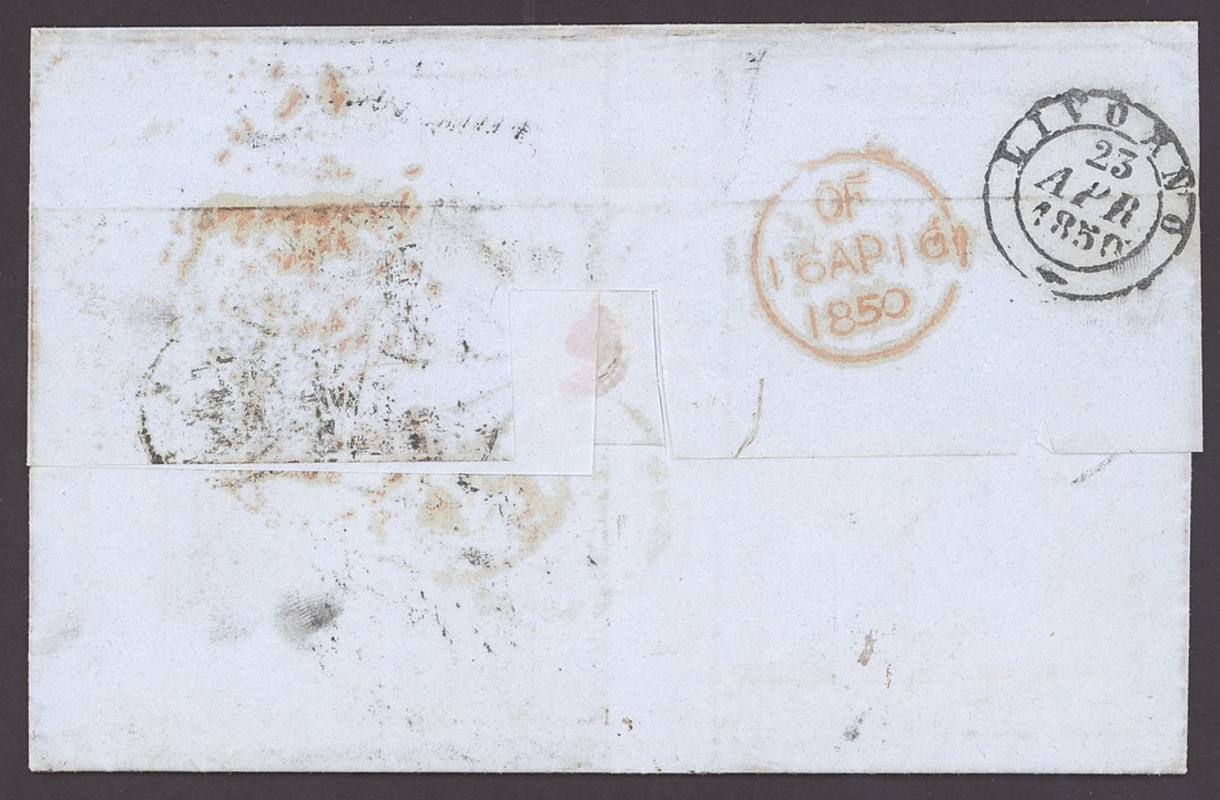 1843-52, incoming Mail, five entires, including 1843 from Barmen to London with red Crown inspectors mark, 1849 Huth correspondence from Mexico to London, 1850 from New York to London, redirected to Livorno, 1852 from Hamburg to Dundee with blue framed