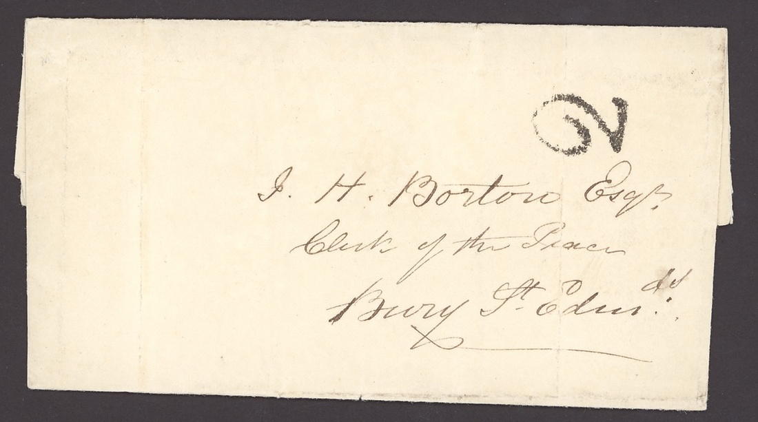 1846 (8 Feb.) entire to Bury St. Edmunds, posted unpaid, on reverse Woodbridge c.d.s. and on the front small (12mm. wide) handstruck "2"; clean vertical filing folds (one through the "2"), fine
