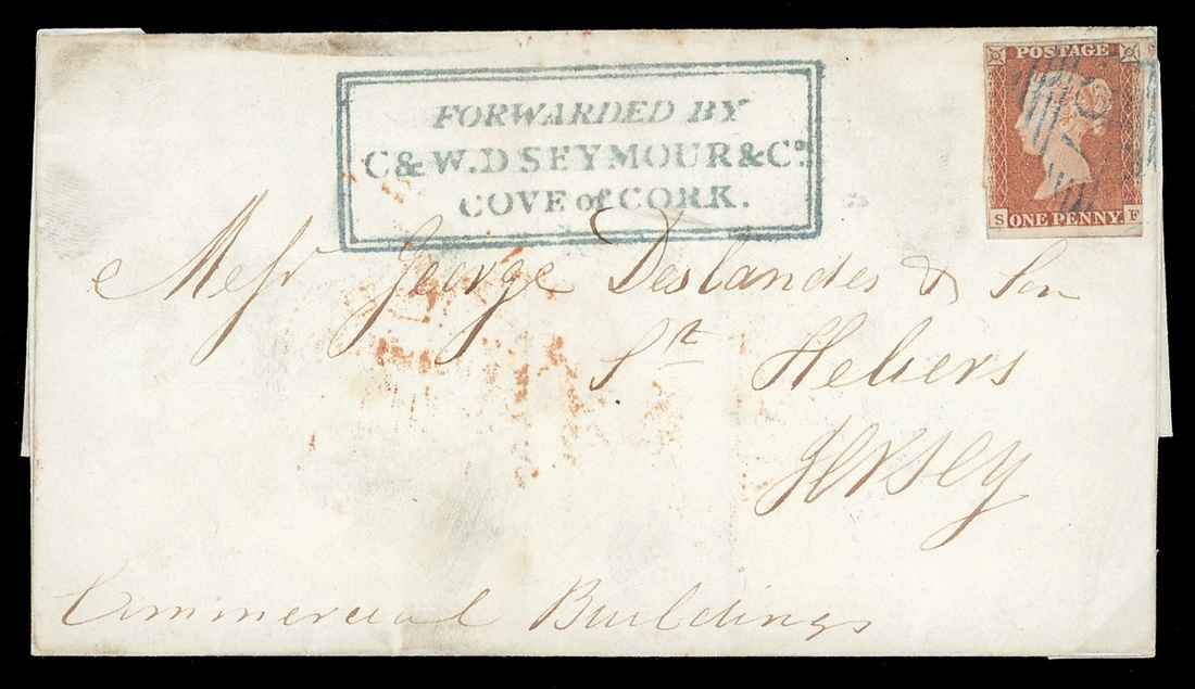 1846 (14 June) entire from Cove to Jersey bearing 1d. red tied by blue '157' barred numeral and bearing superb "