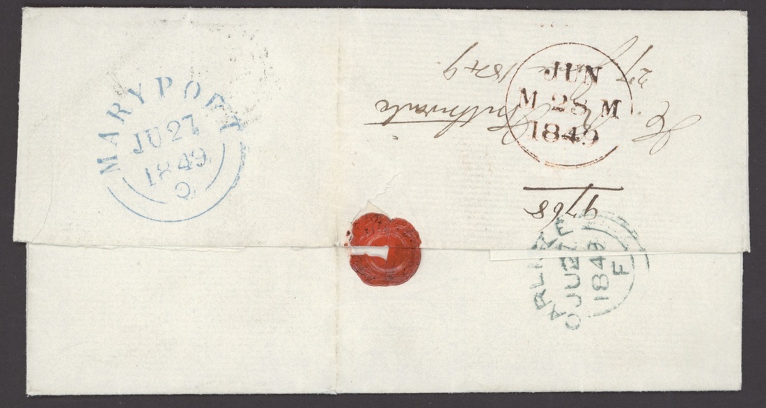 1849 (27 June), entire to Edinburgh with superb handstruck "2" in blue and on reverse matching Maryport c.d.s., clean vertical filing fold clear of the marking, fine and previously unrecorded. Photo