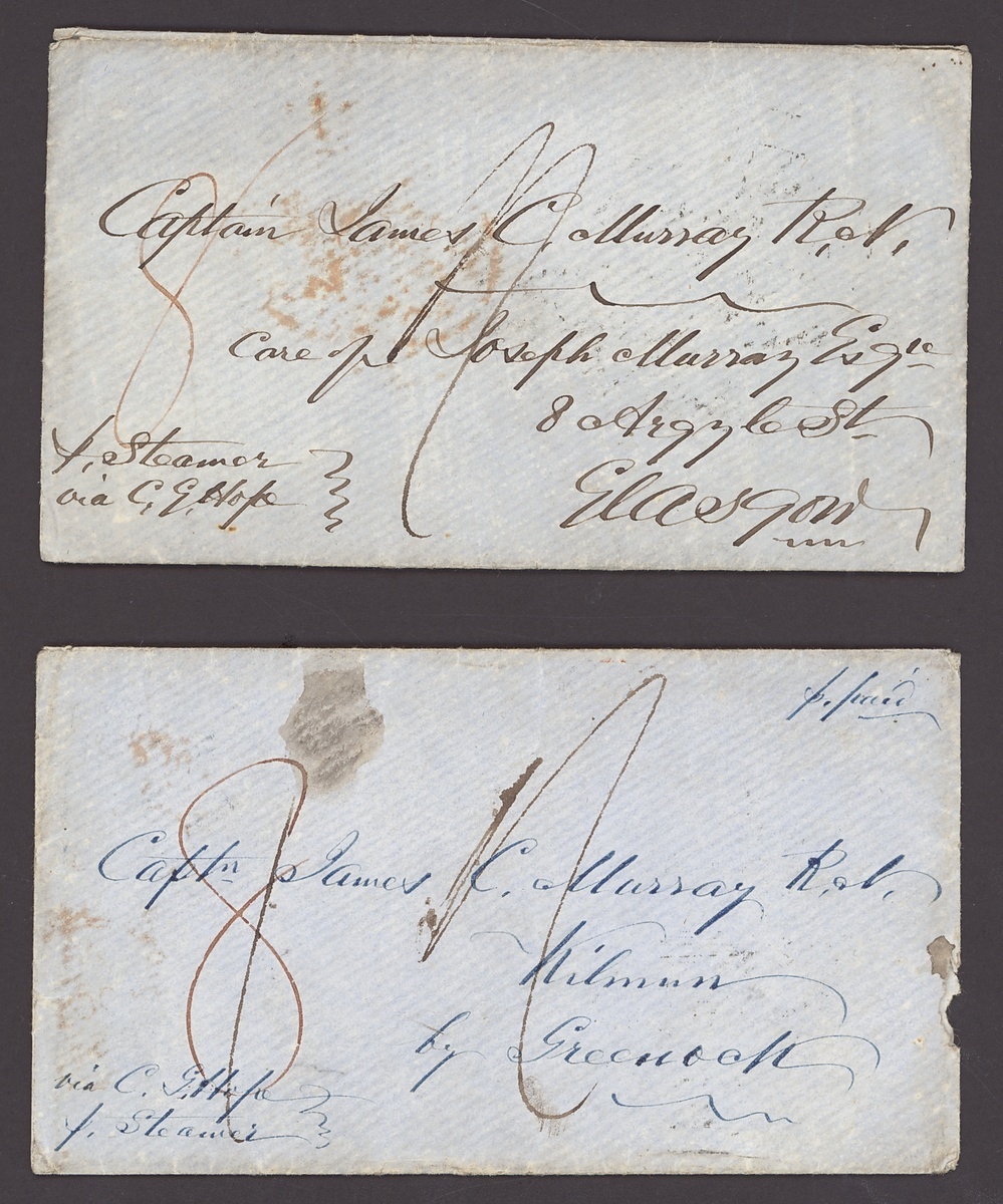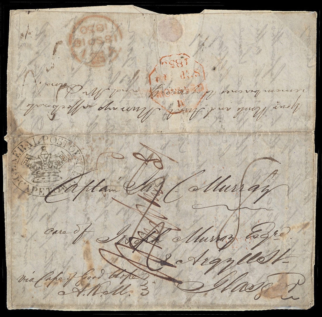 1850 entire letter and 1851 envelopes (2) from Natal ex the A.K. Murray correspondence to his father in Scotland and all rated "8", the first (small imperfections) probably carried by the Rosebud to Cape Town with "