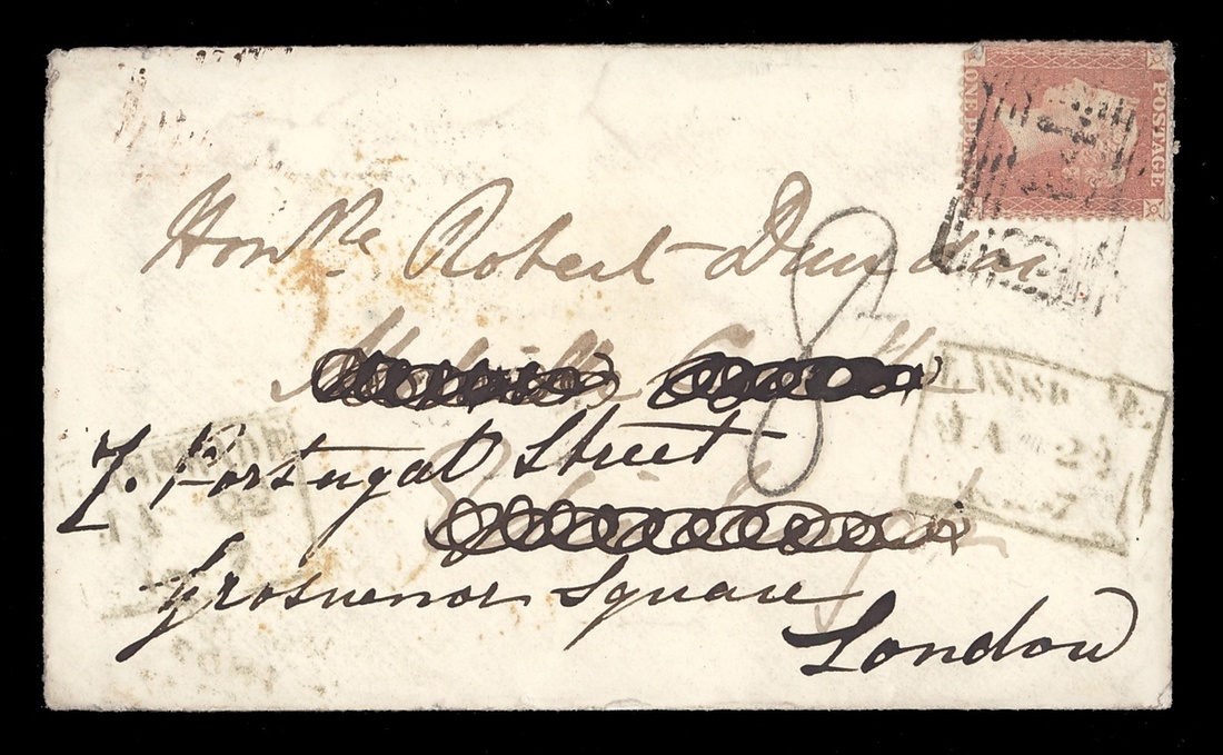 1857 (22 Jan.) envelope to Edinburgh, franked 1d. stars with Scottish "344" cancellation of Lasswade with framed datestamp below, redirected to London and with handstruck "8" Edinburgh Ship Letter mark applied, on reverse a variety of transit and arrival markings, including Liverpool Ship; fine