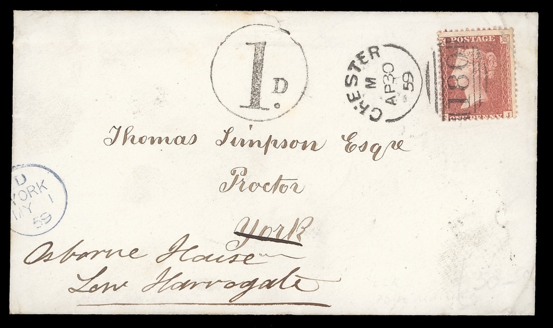 1859 (30 April) envelope to York, franked 1d. stars with "180" sideways duplex cancellation of Chester, on arrival forwarded to Harrogate and with superb "1d." in circle for the unpaid forwarding charge; the envelope a little creased at top (affecting the adhesive); fine and very attractive