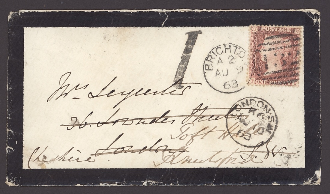 1863 (9 Aug.) mourning envelope to London, franked 1d. stars with "132" duplex cancellation of Brighton, on arrival redirected to Knutsford and with "1" Postage Due handstamp (a type unrecorded by Willcocks & Jay); a few minor perimeter faults; fine