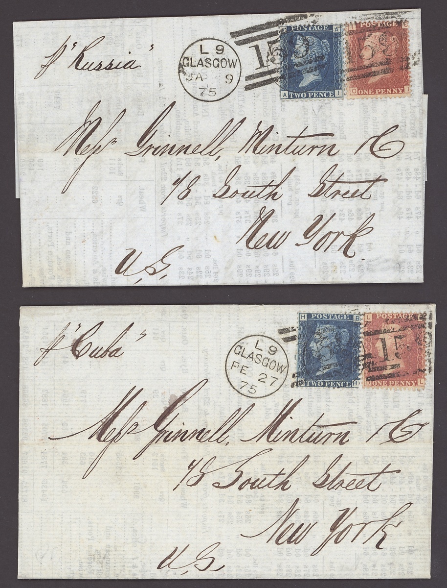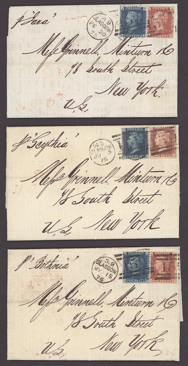1875-76, five printed circulars from Glasgow to Messrs. Grinnell and Minturn in New York, each franked 1d. and 2d. Plate numbers, and carried by different ships ("Russia", "Cuba", "Java", "Scythia" and "Bothnia"); fine and scarce