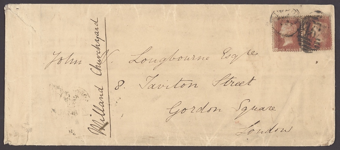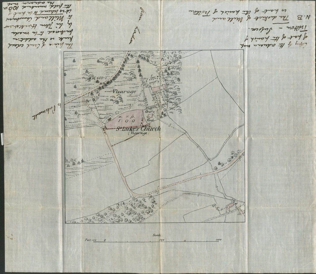 1878 (Feb.) long envelope to London franked 1d. Plate 190 (2), with enclosure, a hand drawn and coloured Copy of the ordanance map of part of the parish of Trotton, including St. Luke's Church, the Vicarage and Grave Yard, on waxed paper; the envelope with fold and tear at left, highly unusual