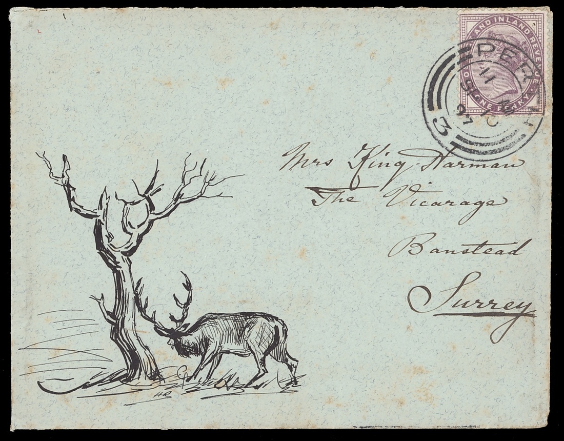 1897 (10 Sept.) envelope from Perth to Surrey, part of the King Harman correspondence bearing 1d. lilac, illustrated in ink depicting a deer beneath a tree, initialled 'H.R.'. Some spotting to envelope though fine and attractive.