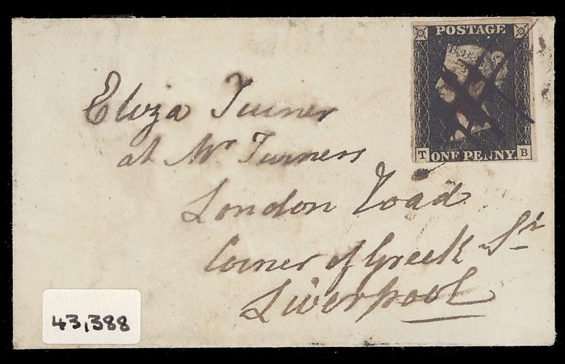 1841 (c.March) miniature envelope to Liverpool bearing 1d. black, Plate 8 (just touched at foot), tied by pen and ink 'hash', with 'Whitchurch' 07.03 d.s. on reverse, envelope a little foxed all over though rare, this being the only known manuscript cancellation from Whitchurch. B.P.A. Certificate (1995)