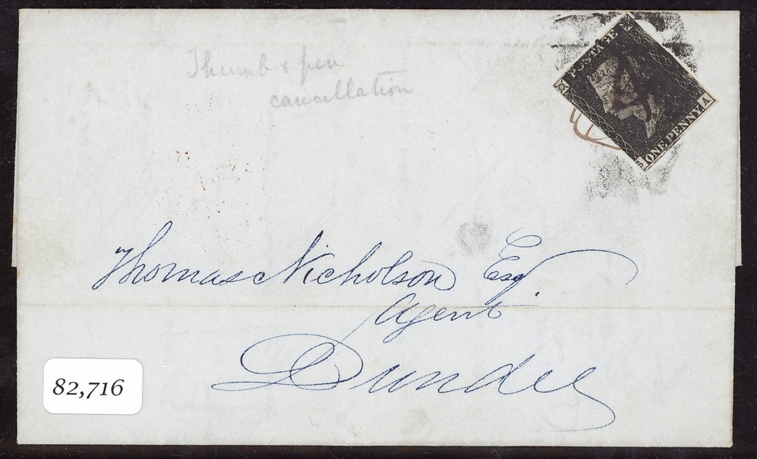 1841 (11 March) entire letter to Dundee bearing 1d. black, Plate 6 (cut into) tied by pen and ink 'squiggle' and possible 'thumb print' cancellation, with Alloa and Edinburgh d.s. on reverse. Unusual. B.P.A. Certificate (2013)