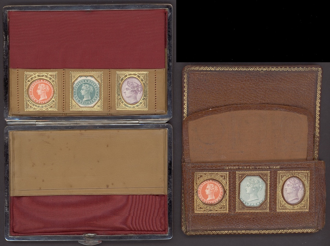 Two Victorian stamp and visiting card wallets opening to reveal three gilded framed compartments designed for the Great Britain Queen Victoria Jubilee stamps. An appealing duo.