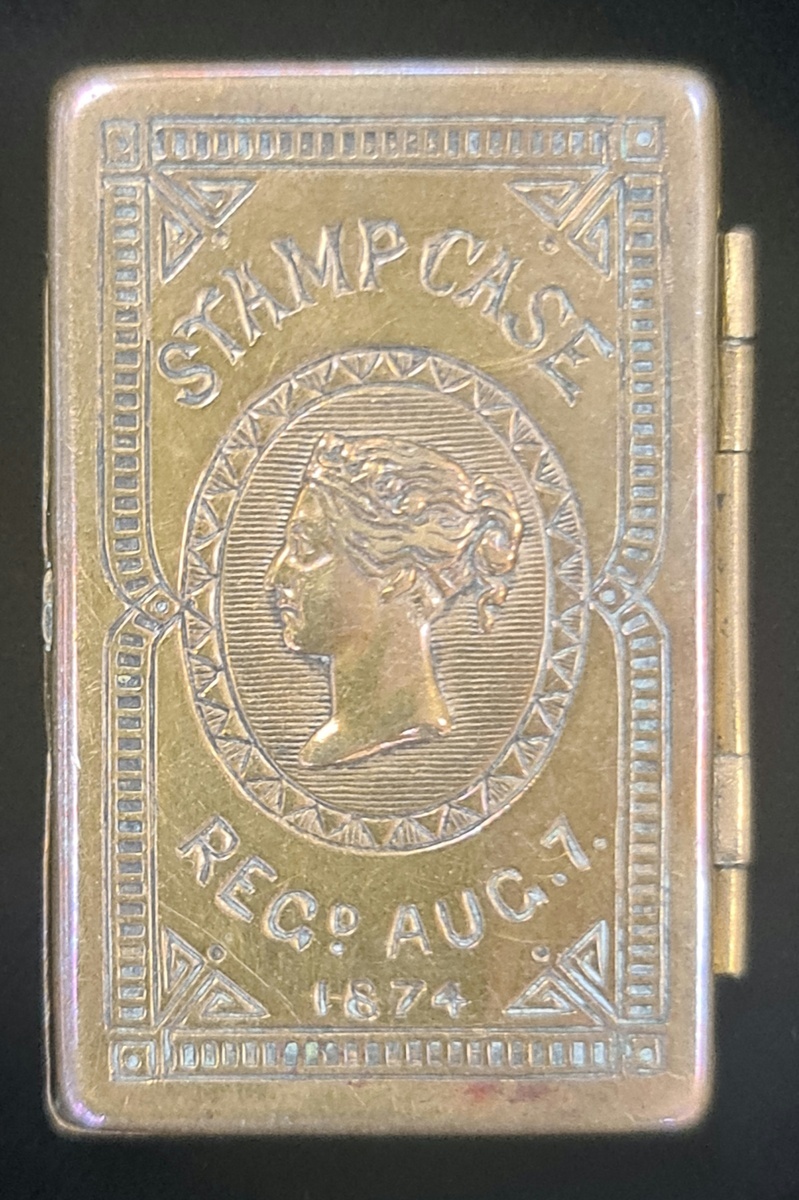 Victorian double sided brass stamp box (Red. 1874, 7 Aug.), opening to four compartments: ½d., 1d., 2d. and R (Revenue). Fine and scarce.