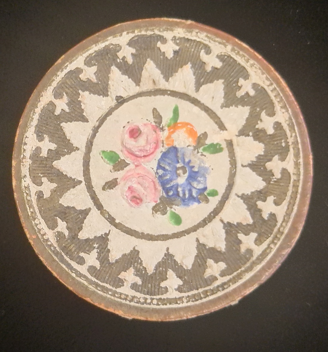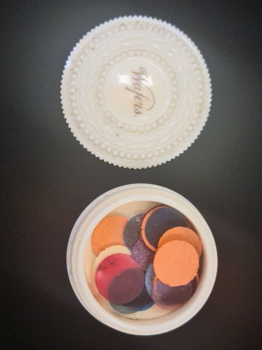 Two circular wafer seal boxes, one bone, the other cardboard, both with decorative lids and with original seals. Scarce and charming
