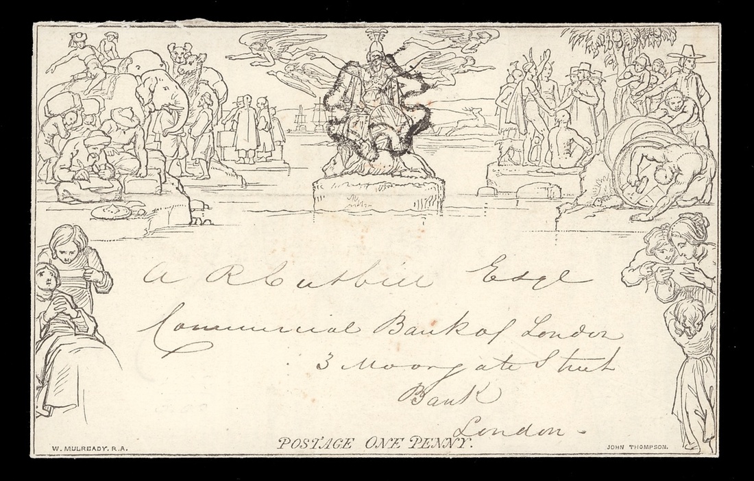 A240 "Family Endowment, Annuity, Life Assurance and Reversionary Interest" advert in blue from Rickmansworth to London, cancelled by black Maltese Cross, dated 1841 (19 July); peripheral faults and reinforcements with pressed filing fold though scarce. Spec. M128a, £850