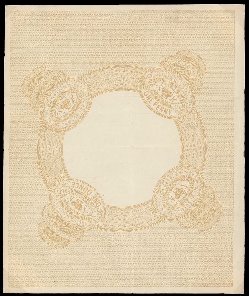 1837 Dickinson 1d. lettersheet in yellow-buff on patent silk thread paper showing the fancy design on engine-turned background, a few folds and minor peripheral faults. Specialised £850