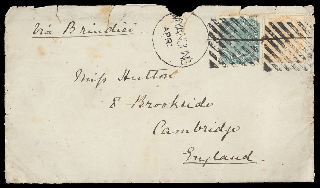 1877 (Apr.) envelope to Cambridge, marked "Via Brindisi", bearing 2a. and 4a. crossed by pen stroke and cancelled by diamond of bars (Type K3) and showing