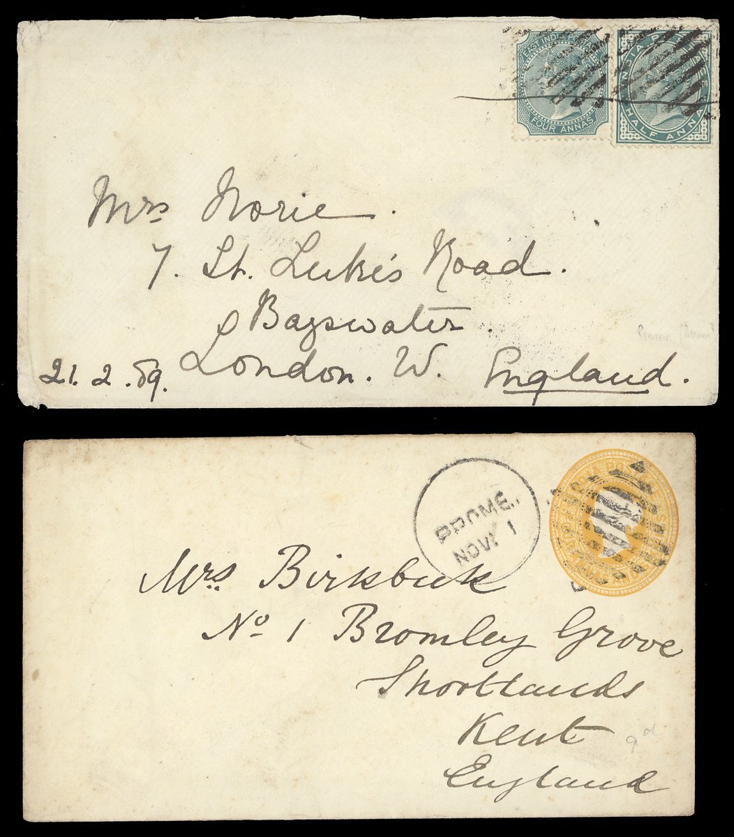 1882 (1 Nov.) 4½a. stationery envelope and 1889 (21 Feb.) envelope bearing ½a. pair, both to England and cancelled by diamond of bars (Type K7; the latter the latest recorded date), the former showing