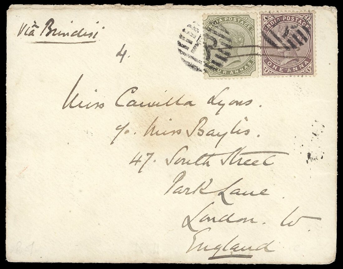 1899 (15 May) envelope to London, marked "Via Brindisi", bearing 1a. and 4a. crossed by pen-stroke and tied by