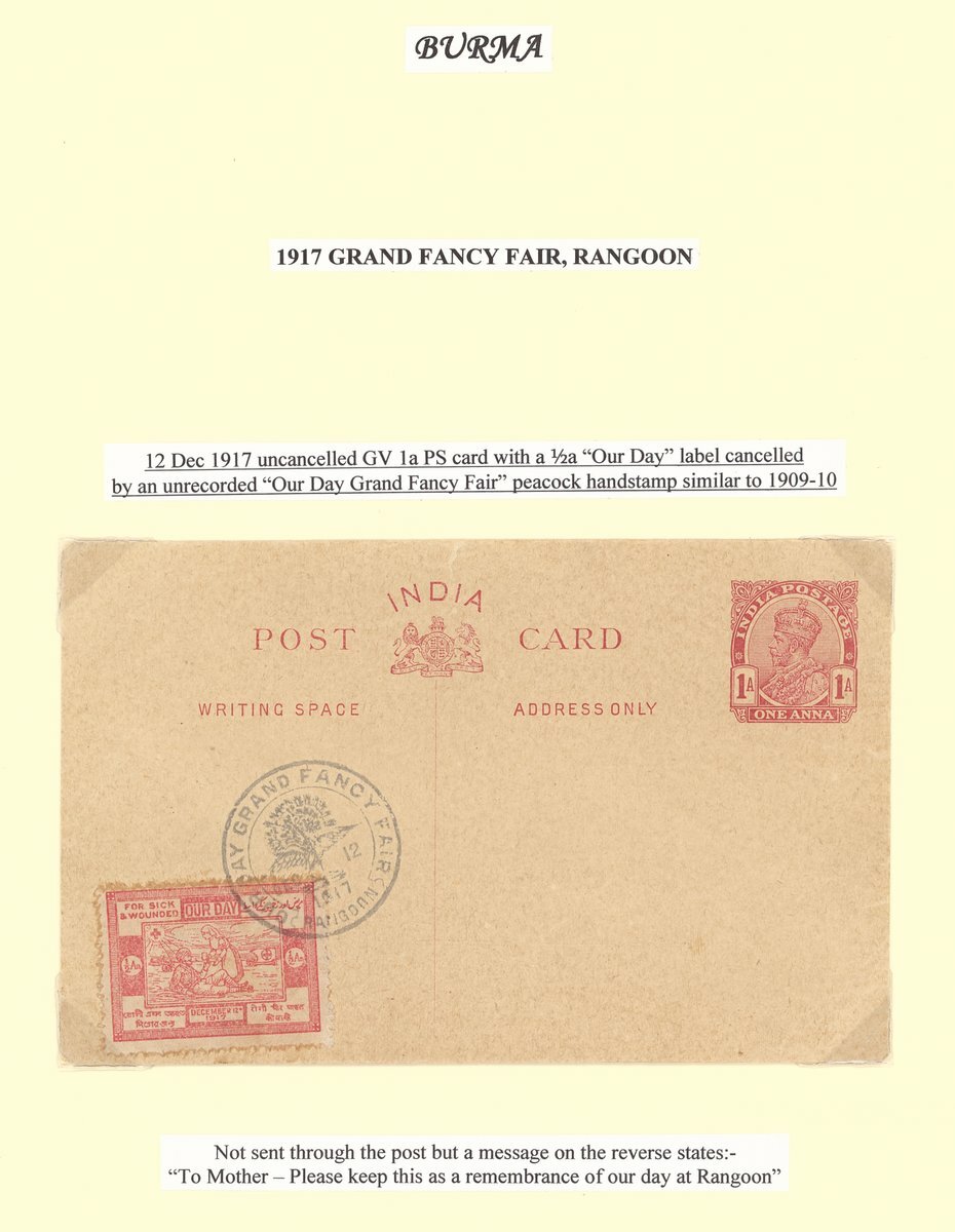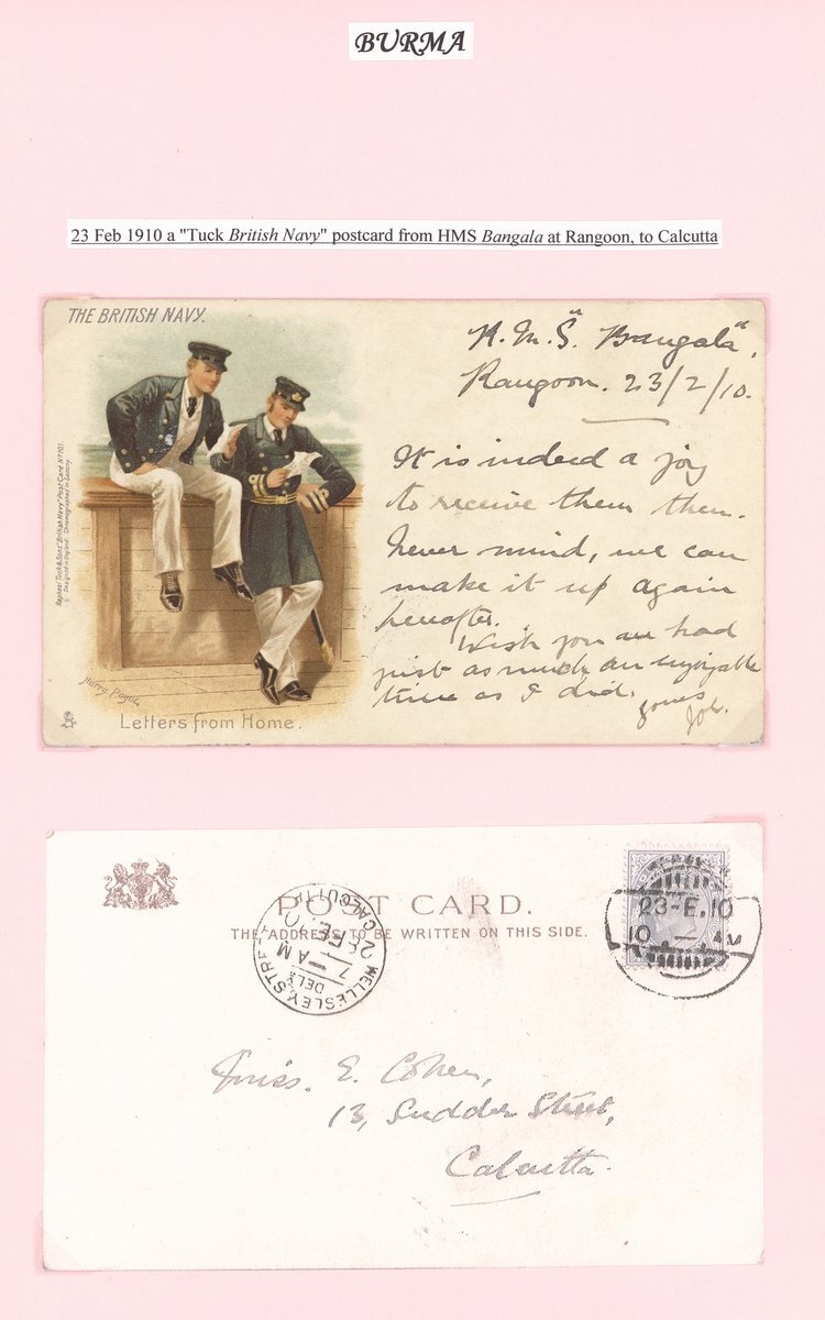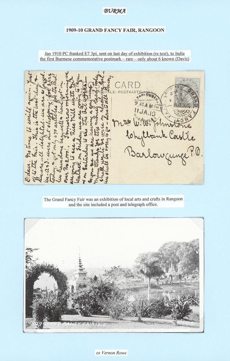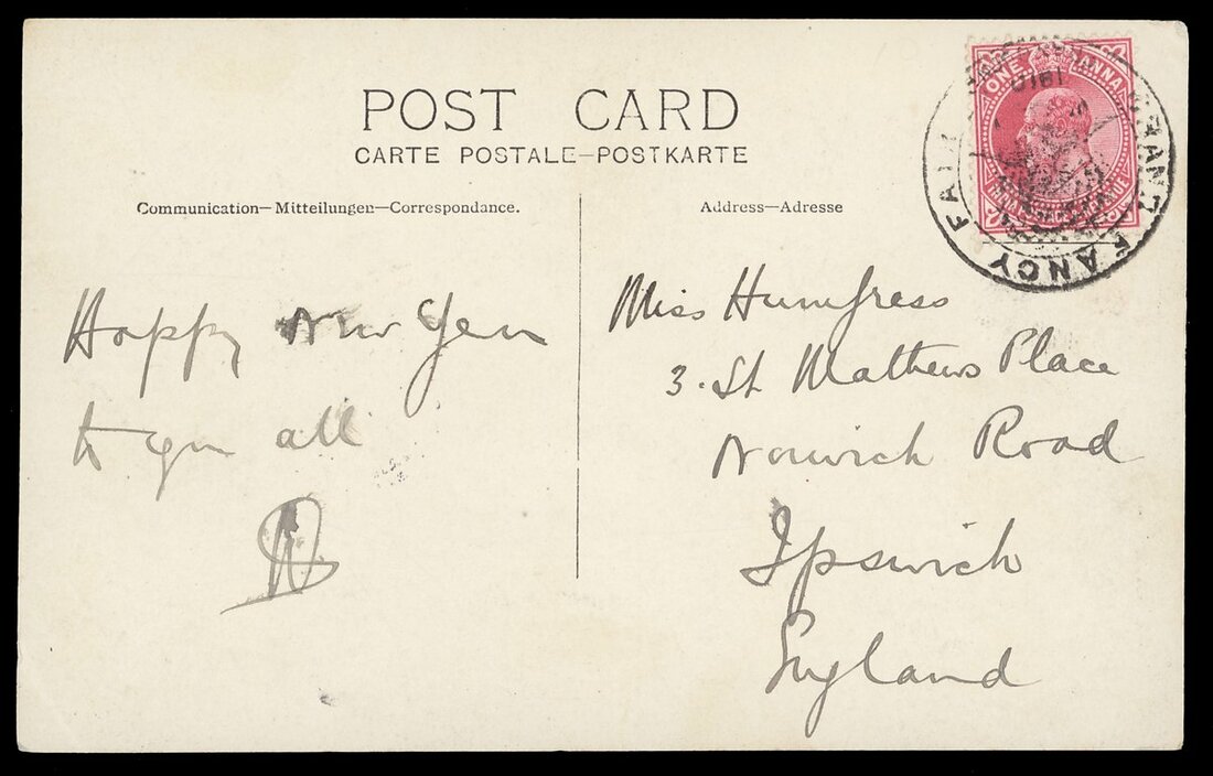 1910 photographic postcards ("1909 Grand Fancy Fair 1910") with different scenes to India and England, bearing 1902 3p. and 1a. respectively, tied by clear circular-framed