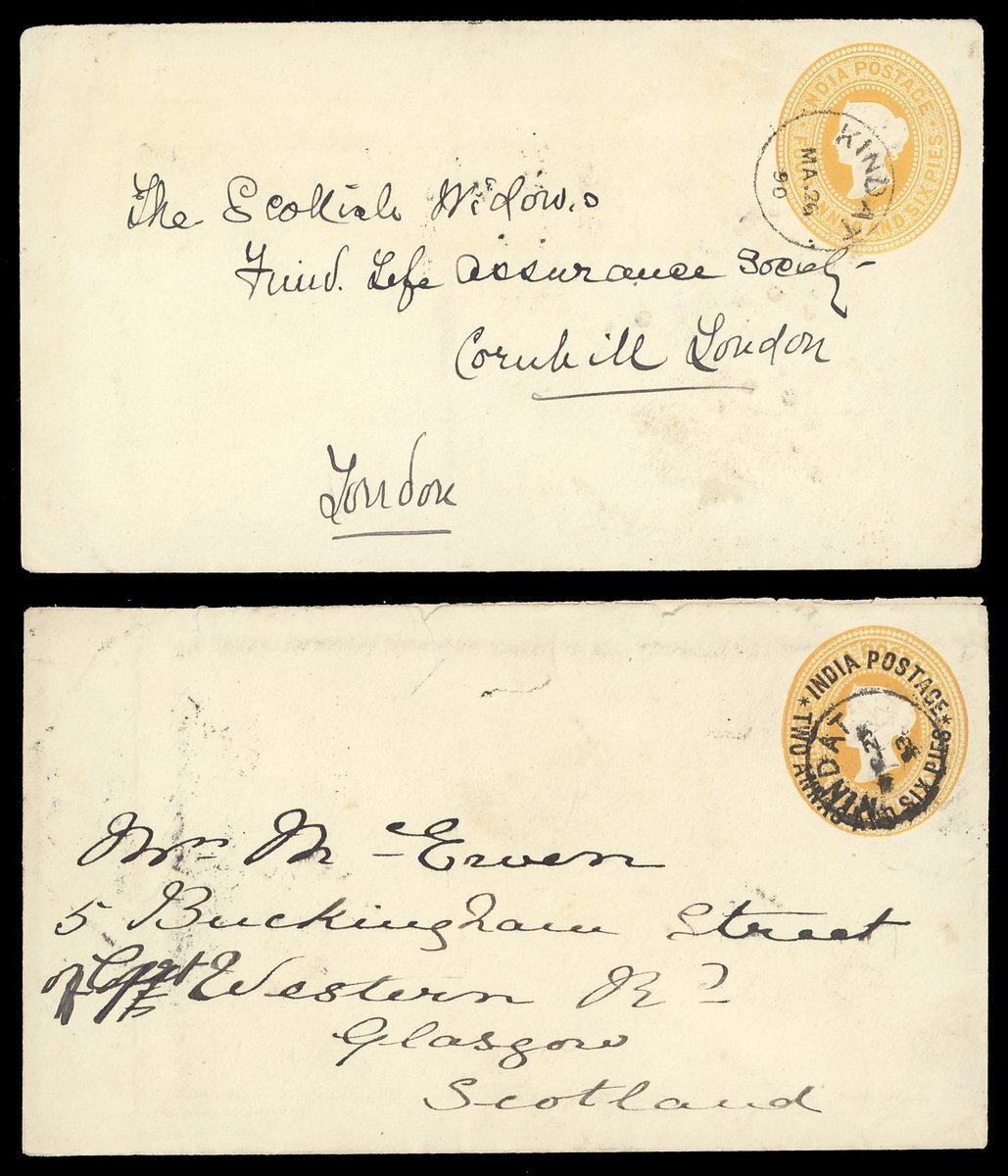 1890 (26 Mar.) 4½a. stationery envelope to London and 1893 (23 May) 2½a. stationery envelope to Glasgow, both cancelled by