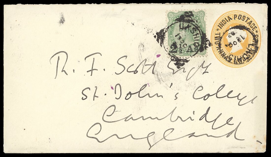 1892 (13 Oct.) 2½a. on 4½a. stationery envelope to Cambridge uprated with 2½a., the former cancelled by small