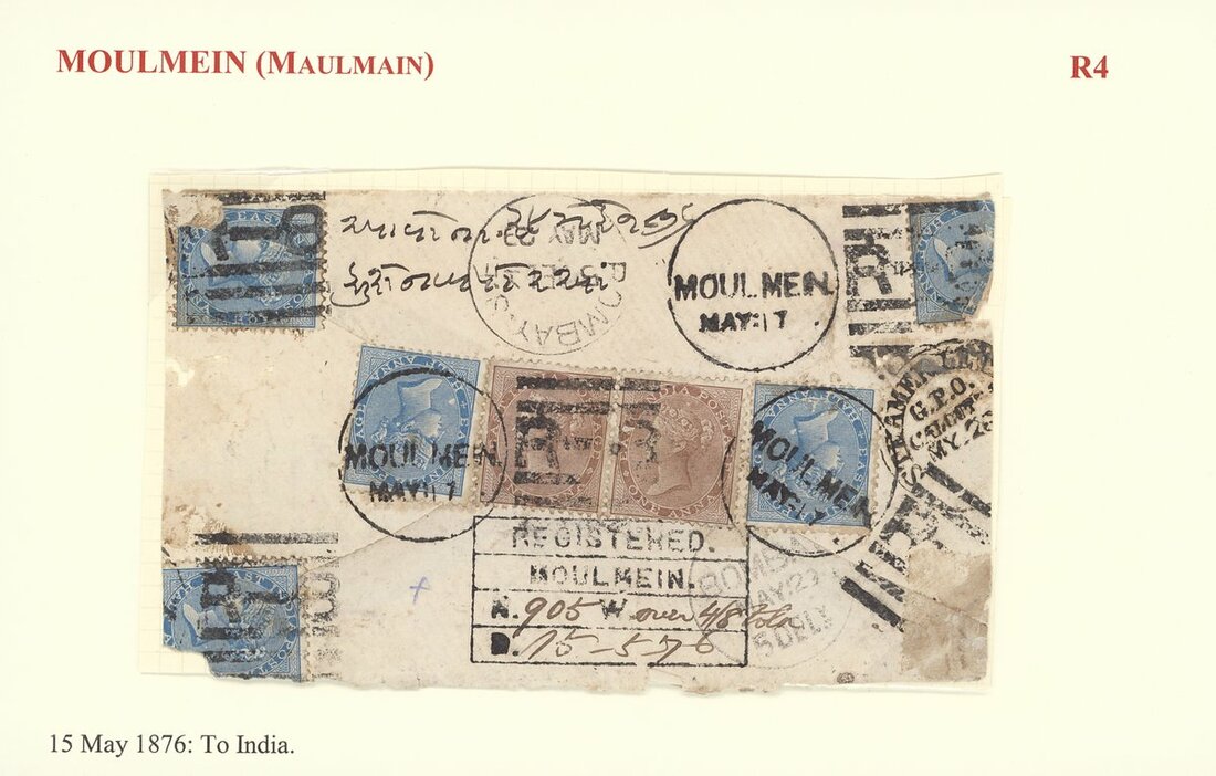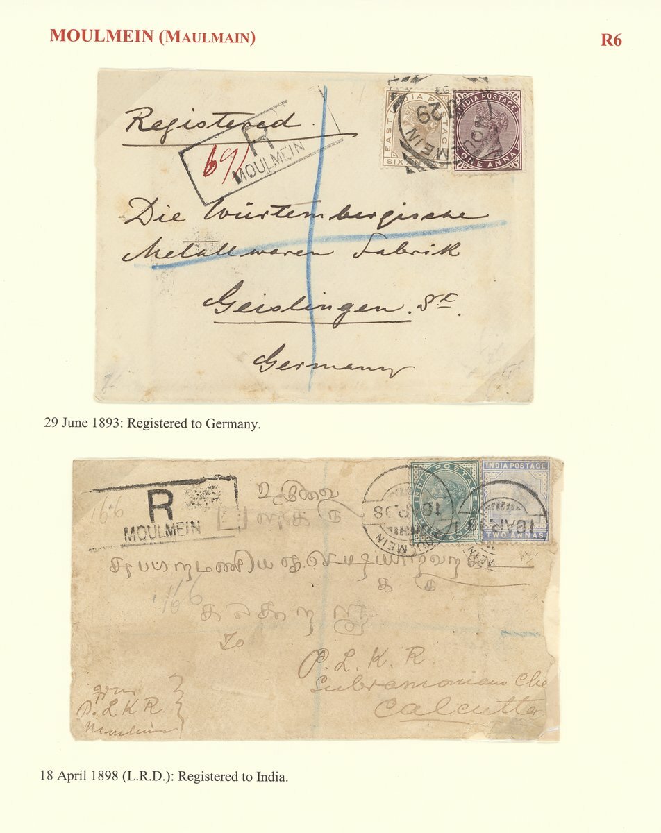 1876 (15 May) back of envelope registered to India, bearing ½a. (5, three damaged) and 1a. pair (two other stamps missing) tied by "R-8" duplex and showing Type R4 registration d.s.; 1893 (29 June) envelope registered to Germany bearing 1a. and 6a. tied by