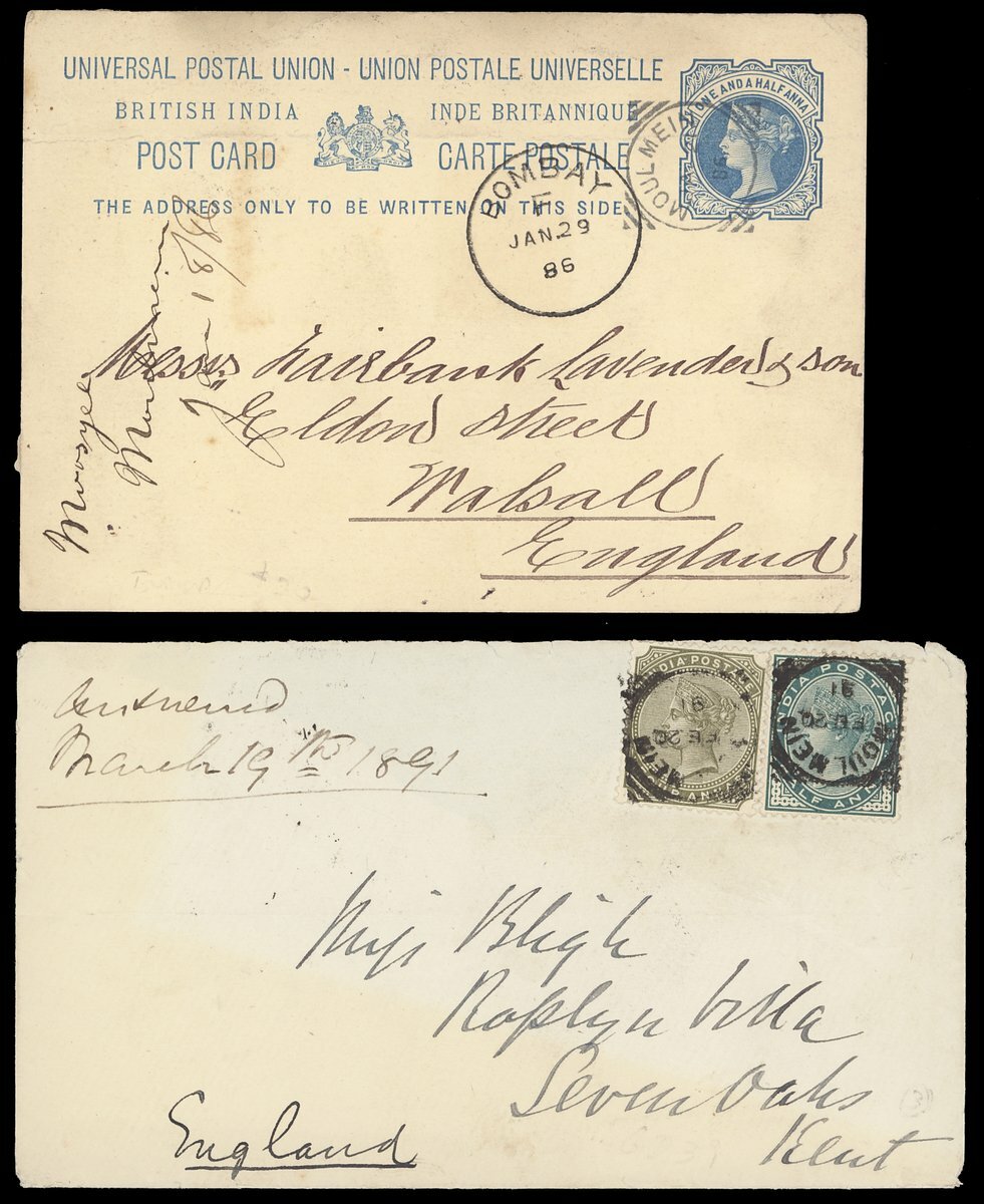 1886 (21 Jan.) 1½a. stationery card (horizontal crease towards top) to England, and 1891 (20 Feb.) envelope to Kent bearing ½a. an 4a., all cancelled by small