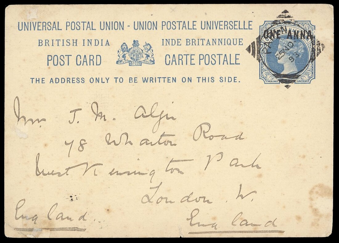 1893 (25 Nov.) 1a. on 1½a. stationery card to London, cancelled by fine